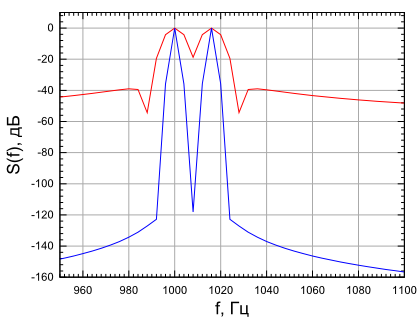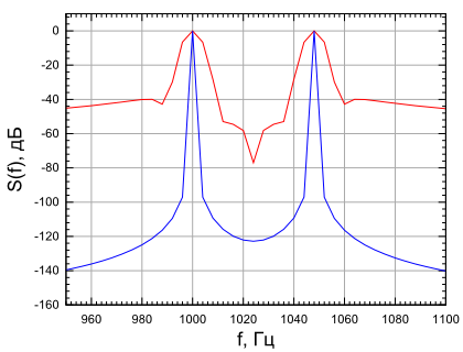 Окно Хемминга при 1024-точечном БПФ (без полифазной обработки), и окно Блэкмана-Харриса при полифазном БПФ на 4096 точек.